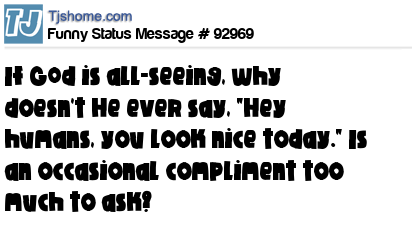 X If G0d is all-seeing, why doesn't He ever say, "Hey humans, you look nice today." Is an occasional compliment too much to ask?