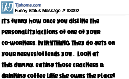 X says It's funny how once you dislike the personality/actions of one of your co-workers, EVERYTHING They do gets on your nerves/offends you . “Look at this dummy, eating those crackers & drinking coffee like she owns the place! Uggghh"