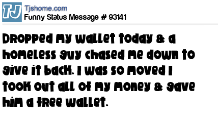 X Dropped my wallet today & a homeless guy chased me down to give it back. I was so moved I took out all of my money & gave him a free wallet.