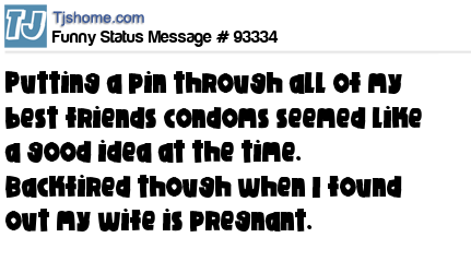 X Putting a pin through all of my best friends condoms seemed like a good idea at the time. Backfired though when I found out my wife is pregnant.