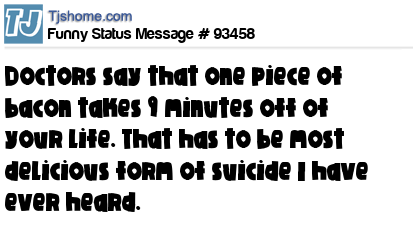 - # 93881 Doctors say that one piece of bacon takes 7 minutes off of your life. That has to be most delicious form of suicide.