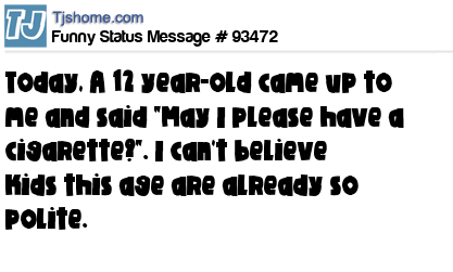 X Today, A 12 year-old came up to me and said "May I please have a cigarette?". I can't believe kids this age are already so polite.