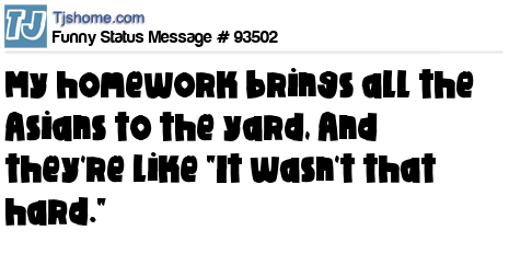- # 115294 My homework brings all the Asians to the yard, and they're like "It wasn't that hard"