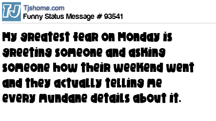 X says My greatest fear on Monday is greeting someone and asking someone how their weekend went and they actually telling me every mundane details about it.