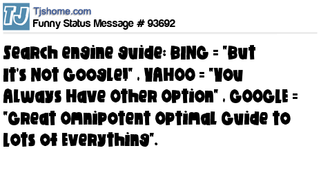 X is Search engine guide: BING = "But It's Not Google!" , YAHOO = "You Always Have Other Option" , GOOGLE = "Great Omnipotent Optimal Guide to Lots of Everything".