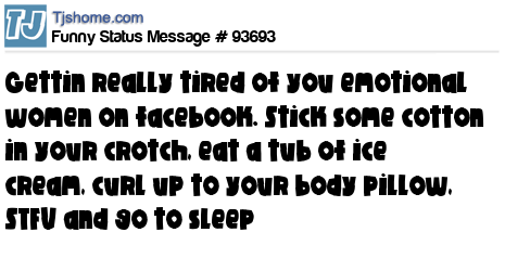 X says Gettin really tired of you emotional women on facebook. Stick some cotton in your crotch, eat a tub of ice cream, curl up to your body pillow, STFU and go to sleep