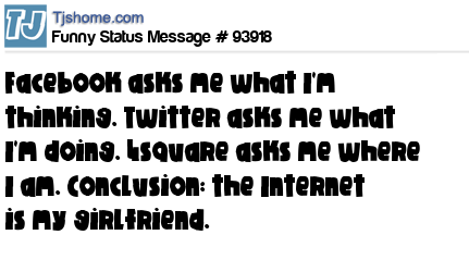 - # 48159 FACEBOOK asks me what I'm thinking, TWITTER asks me what I'm doing, FOURSQUARE asks me where I am. Conclusion: Internet is my girlfriend!