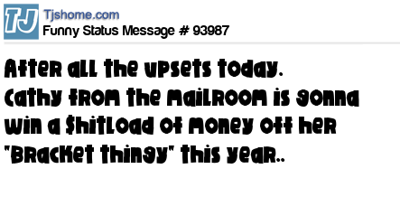 X  After all the upsets today. Cathy from the mailroom is gonna win a $hitload of money off her "Bracket thingy" this year..