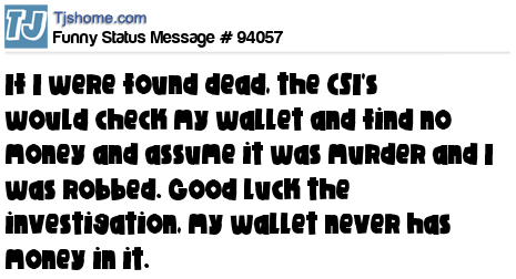 X If I were found dead, the CSI's would check my wallet and find no money and assume it was murder and I was robbed. Good luck the investigation, my wallet never has money in it.