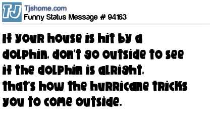 - # 78640 If your apartment is hit by a dolphin DO NOT GO OUT TO SEE IF THE DOLPHIN IS OK. That's just how the hurricane tricks you into coming outside.