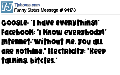 - # 72643 Google: I have everything! Facebook: I know everybody! Internet: Without me you are nothing! Electricity: Keep talking!