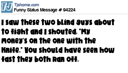 X says I saw these two blind guys about to fight and I shouted, "My money's on the one with the knife." You should have seen how fast they both ran off.