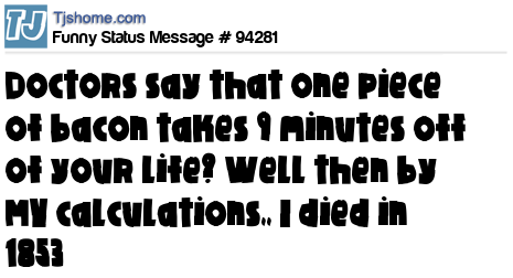 - # 147245 Doctors are saying that each piece of bacon you eat takes 9 minutes off your life.... Based on the math, I should haved died in 1732.