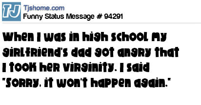 X When I was in high school my girlfriend's dad got angry that I took her virginity. I said "Sorry, it won't happen again."