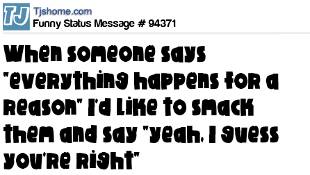 X When someone says "everything happens for a reason" I'd like to smack them and say "yeah, I guess you're right"