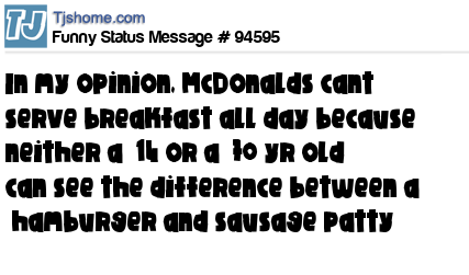 X is In my opinion, McDonalds cant serve breakfast all day because neither a 14 or a 70 yr old can see the difference between a hamburger and sausage patty