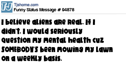 X I believe aliens are real. If I didn't, I would seriously question my mental health cuz SOMEBODY'S been mowing my lawn on a weekly basis.