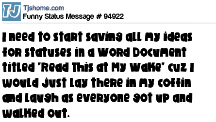 X I need to start saving all my ideas for statuses in a Word Document titled "Read This at My Wake" cuz I would just lay there in my coffin and laugh as everyone got up and walked out.