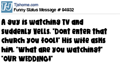 X A guy is watching TV and suddenly Yells, "Dont enter that church you fool!" His wife asks him, "What are you watching?" "OUR WEDDING!"