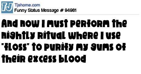 X And now I must perform the nightly ritual where I use "floss" to purify my gums of their excess blood