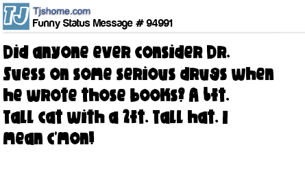 X is Did anyone ever consider Dr. Suess on some serious drugs when he wrote those books? A 6ft. Tall cat with a 2ft. Tall hat. I mean c'mon!