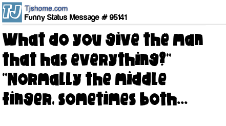 X is What do you give the man that has everything?'' ''Normally the middle finger, sometimes both...