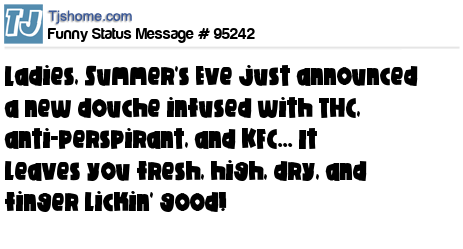 - # 73482 Summer's Eve announced a new douche infused with THC, anti-perspirant, & KFC... It leaves you fresh, high, dry, and finger lickin' good!