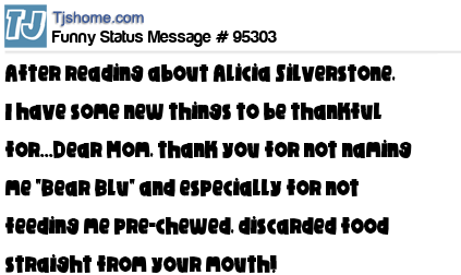 X After reading about Alicia Silverstone, I have some new things to be thankful for...Dear Mom, thank you for not naming me "Bear Blu" and especially for not feeding me pre-chewed, discarded food straight from your mouth!