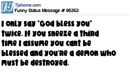- # 156574 1st sneeze: Bless you. 2nd sneeze: Bless you 3rd sneeze: Get out of my life until you are finished with whatever this is