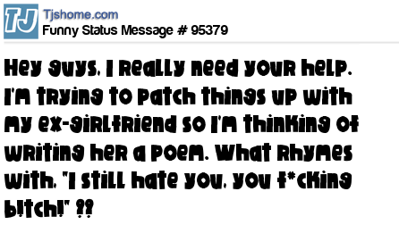 X  Hey guys, I really need your help. I'm trying to patch things up with my ex-girlfriend so I'm thinking of writing her a poem. What rhymes with, "I still hate you, you f*cking b!tch!" ??