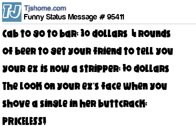 X is Cab to go to bar: 30 dollars 4 rounds of beer to get your friend to tell you your ex is now a stripper: 70 dollars The look on your ex's face when you shove a single in her buttcrack: PRICELESS!