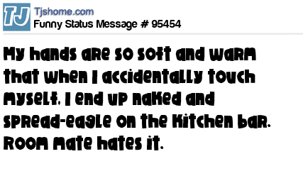 X is My hands are so soft and warm that when I accidentally touch myself, I end up naked and spread-eagle on the kitchen bar. Room mate hates it.