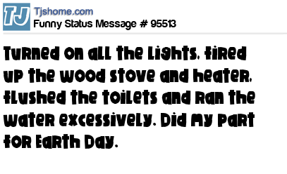 X is Turned on all the lights, fired up the wood stove and heater, flushed the toilets and ran the water excessively. Did my part for Earth Day.