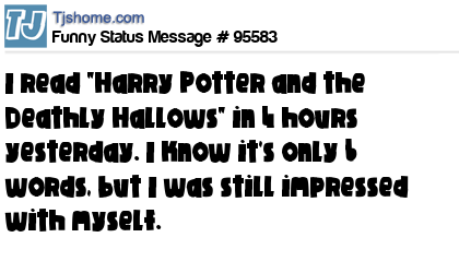 X is I read "Harry Potter and the Deathly Hallows" in 4 hours yesterday. I know it's only 6 words, but I was still impressed with myself.
