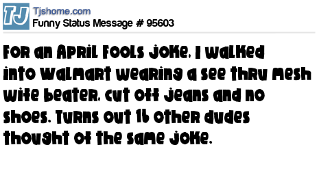 X is for an April Fools joke, I walked into Walmart wearing a see thru mesh wife beater, cut off jeans and no shoes. Turns out 16 other dudes thought of the same joke.