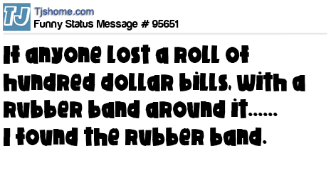 - # 144215 If anyone lost a roll of $20 bills with a rubber band around it...... I found it, spent the money and shot the rubber band at a suspicious looking squirrel that was eyeing my Reese's Pieces.