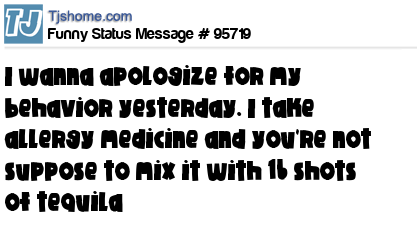 X says I wanna apologize for my behavior yesterday. I take allergy medicine and you're not suppose to mix it with 16 shots of tequila