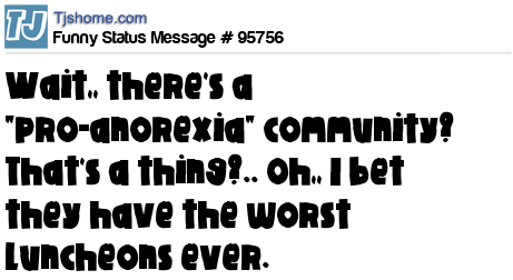 X Wait,, there's a "pro-anorexia" community? That's a thing?.. Oh,, I bet they have the worst luncheons ever.