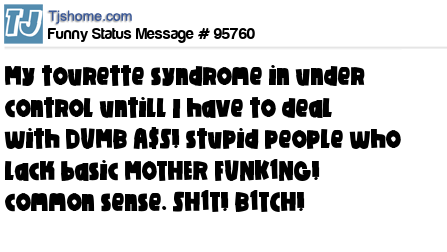 X My tourette syndrome in under control untill I have to deal with DUMB A$S! stupid people who lack basic MOTHER FUNK1NG! common sense. SH1T! B1TCH!