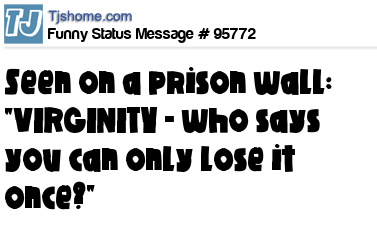 X Seen on a prison wall: "VIRGINITY - who says you can only lose it once?"