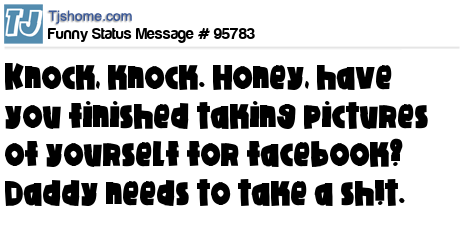 X says Knock, knock. Honey, have you finished taking pictures of yourself for facebook? Daddy needs to take a sh!t.