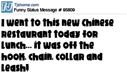 X I went to this new Chinese restaurant today for lunch... it was off the hook, chain, collar and leash!