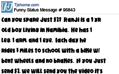X says can you spare just $2? Ranji is a 9 yr old boy living in Namibia. He has 1 leg, 1 arm, and 1 eye. Each day he rides 7 miles to school with a bike w/ bent wheels and no brakes. If you just send $2, we will send you the video it's freaking hilarious.