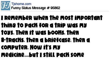 X says I remember when the most important thing to pack for a trip was my toys. Then it was books, then 8-tracks, then a briefcase, then a computer. Now it's my medicine....but I still pack some toys!
