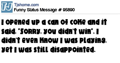 - # 100776 I opened up a bottle of coke and it said, "Sorry, you didn't win". I didn't even know I was playing, yet I was still disappointed.