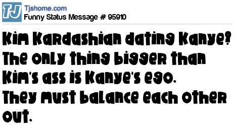 X is Kim Kardashian dating Kanye? The only thing bigger than Kim's ass is Kanye's ego. They must balance each other out.