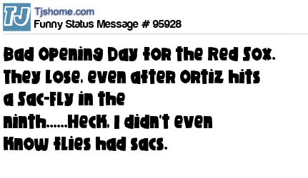 X is Bad Opening Day for the Red Sox. They lose, even after Ortiz hits a Sac-Fly in the ninth......Heck, I didn't even know flies had sacs.
