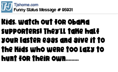 - # 54308 Happy Easter and remember kids, watch out for Obama supporters. They will take 1/2 your eggs and give them to the kids who were to lazy to hunt for their own......