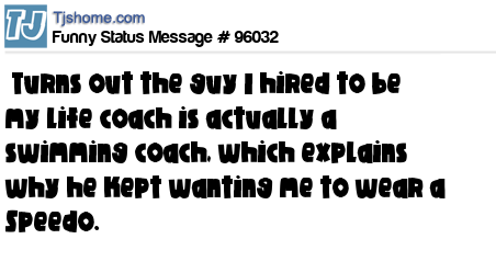 X says Turns out the guy I hired to be my life coach is actually a swimming coach, which explains why he kept wanting me to wear a Speedo.