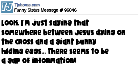 X says Look, I'm just saying that somewhere between Jesus dying on the cross and a giant bunny hiding eggs... There seems to be a gap of information!
